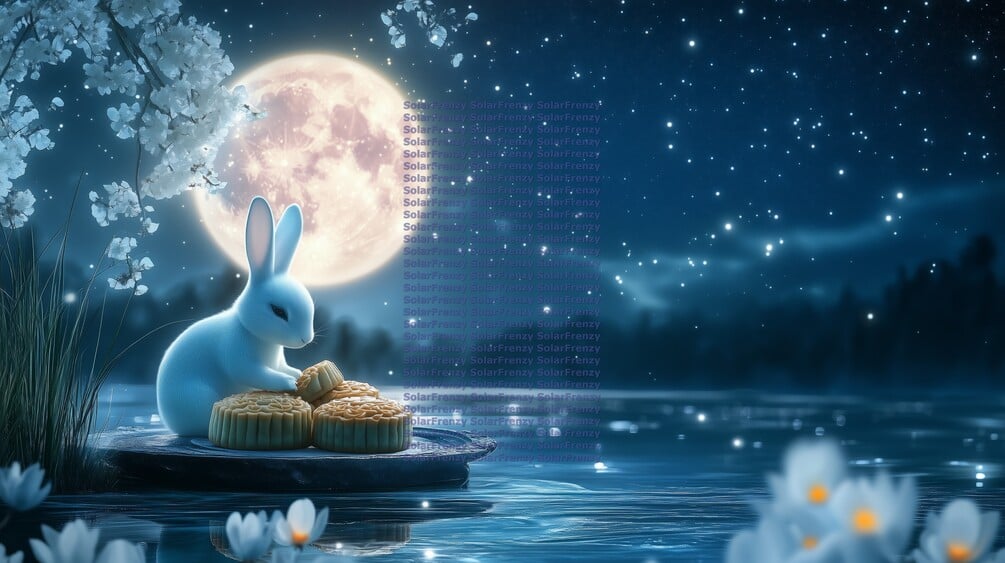 In this captivating scene, the Jade Rabbit sits peacefully by a tranquil lake under the glowing light of a full moon. The rabbit is carefully crafting mooncakes, a symbol of the Mid-Autumn Festival, surrounded by blooming lotus flowers and delicate cherry blossoms. The stars twinkle above, adding to the magical atmosphere of the night, while the moon reflects on the still waters, completing the serene setting.